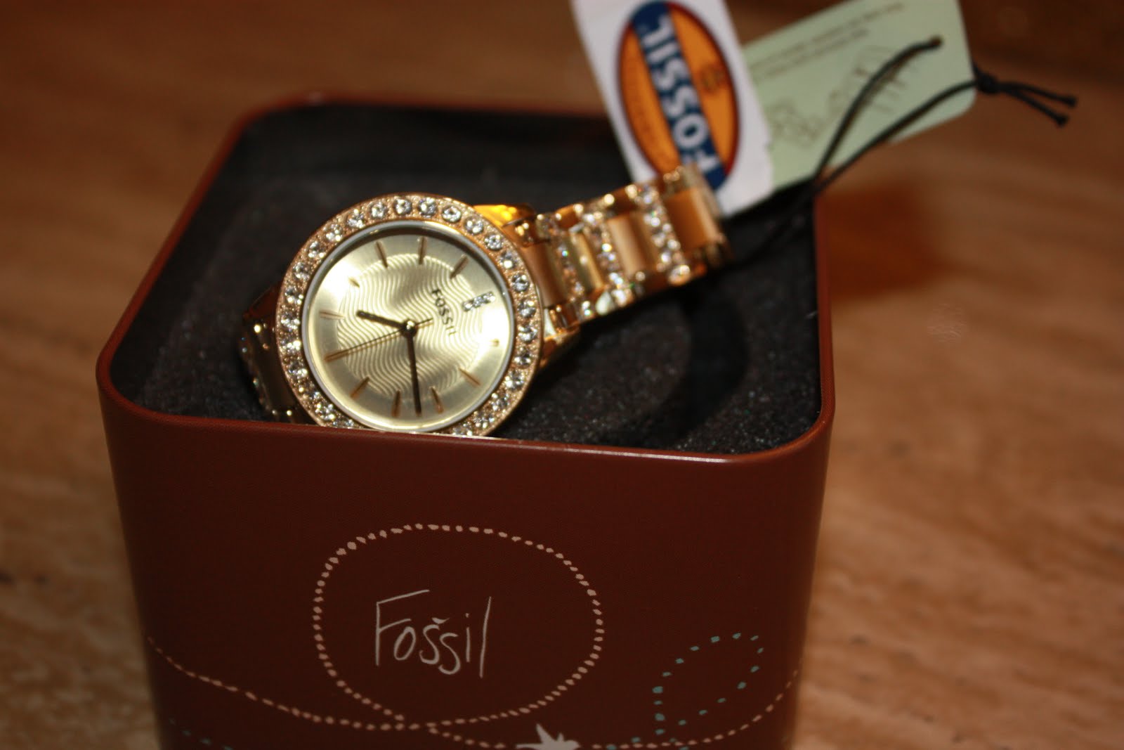 This new watch I bought today its amazing its fossil and its gold with stones , at first I wasn't to sure about it but now I love it